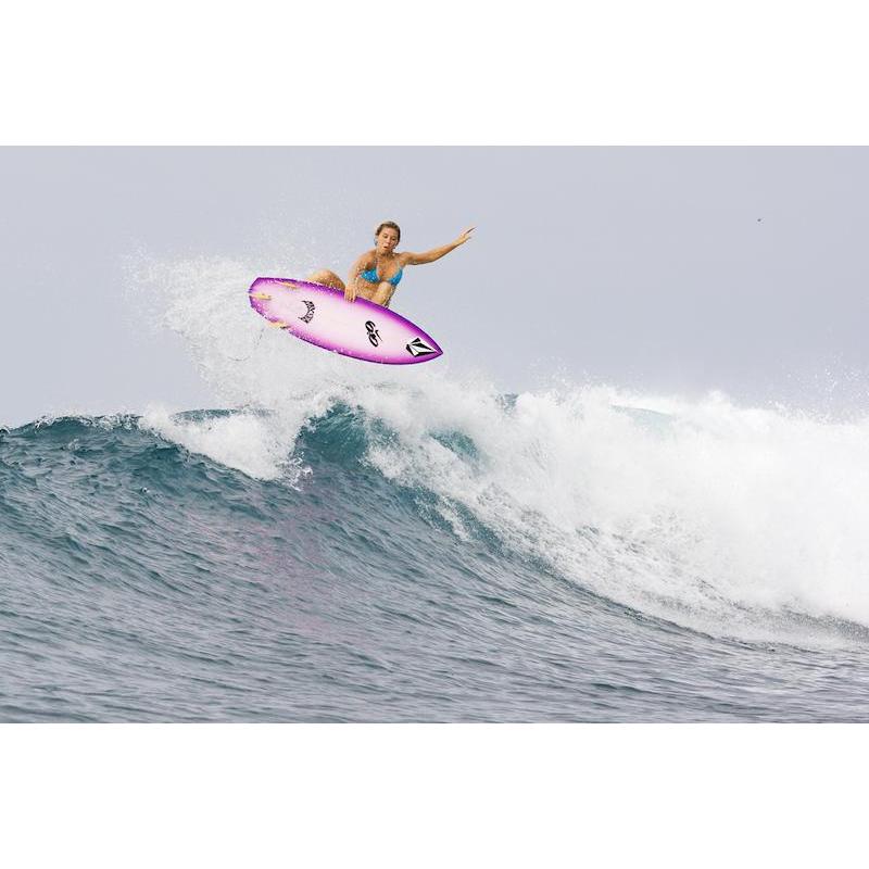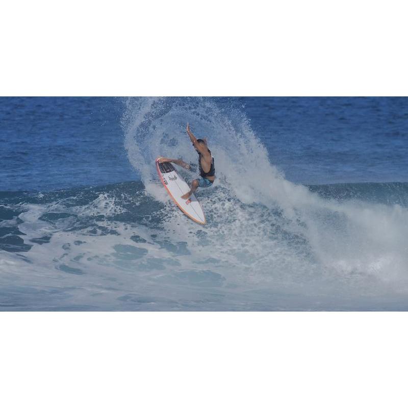 The extremely low and fast entry rocker, counterbalanced by a hyper-extended tail curve, for instantaneous down the line drive and playfully precise turning. The deepest of concaves, created by a straight centerline stringer and a curvaceous rail rocker lends lift and liveliness. The wide tail and parallel, bullet like, outline provides plenty of speed and hold. The hooked diamond “Rocket” tail adds bite and hold in firm, rear footed carves.