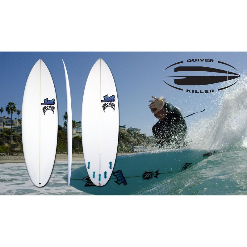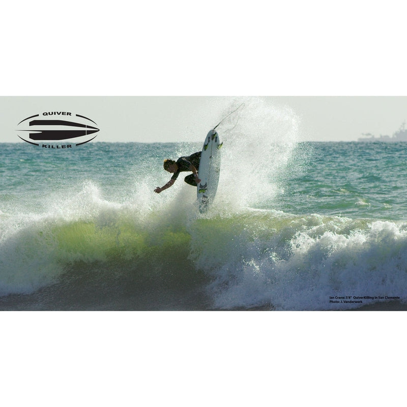 Beginning with the ShortRound, we added a couple inches of length, moderately added to the overall rocker, and pulled the nose outline in a bit. We then changed the tail to a forgiving, rounded “thumb” tail without narrowing it too much where the front fins are. The overall outline and rocker lines are a minimalistic and simplistic continuous curve. The surface area and volume are still generous enough to create speed and feel lively in anything but the smallest, or true “grovel” surf. The rounded tail, reduced nose area, and the added rocker, prevents too much rail being wetted at once in small surf, and allows control and ease of pocket and power surfing in proper waves. Free and easy in small-ish surf while still precise and forgiving in solid surf. Staying with the ammo theme, we swapped the stubby little speeding bullet for the new logo, an elongated, spitzer influenced ammunition. The Quiver Killer... a shot straight through the heart.